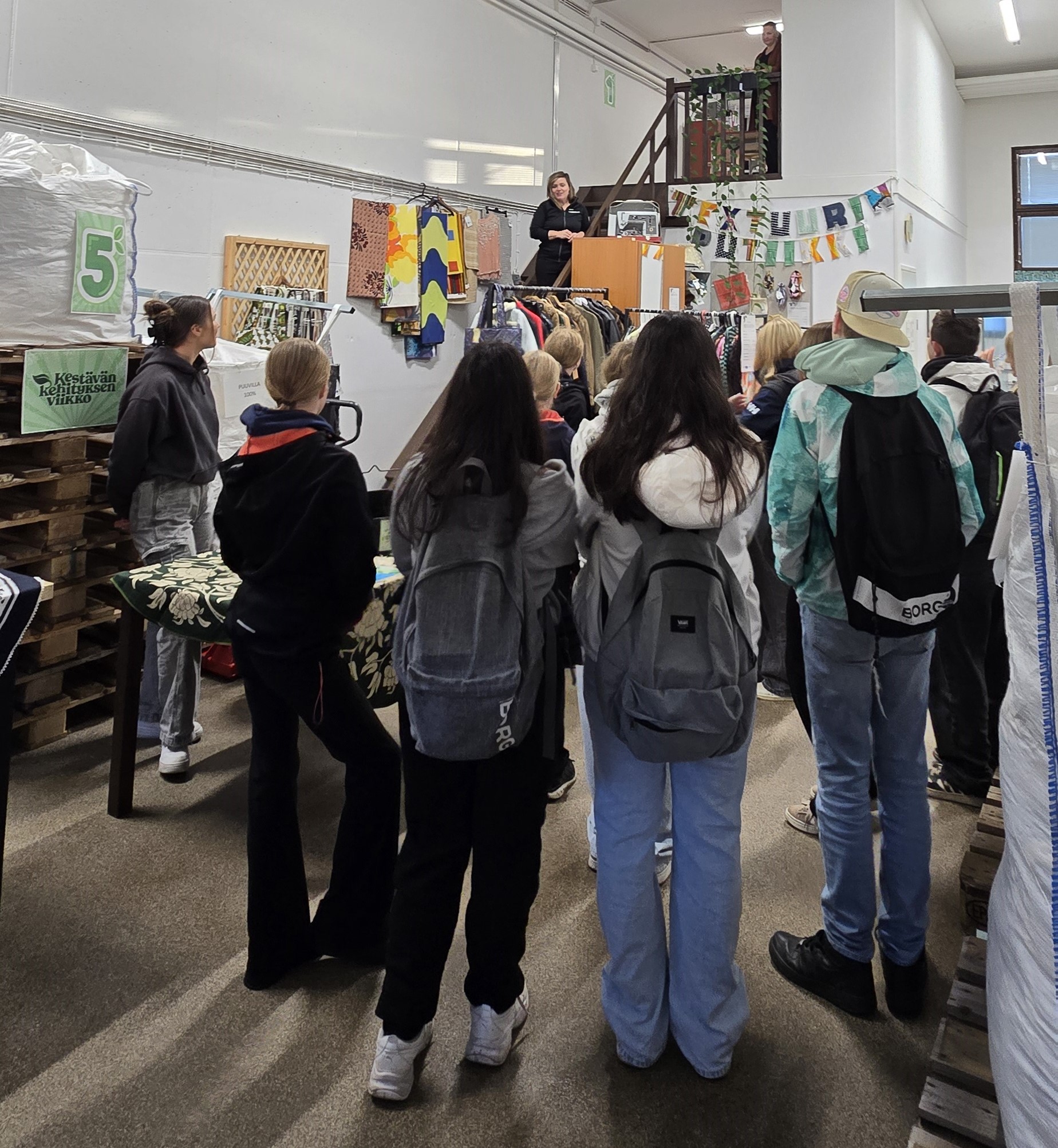 Tekstiilien lajittelupisteellä nuoret opettelivat tunnistamaan eri kangaslaatuja ja Textuuri-hankkeen vastaava ohjaaja Marianne Mäkelä kertoi pikamuodista ja sen ympäristövaikutuksista.