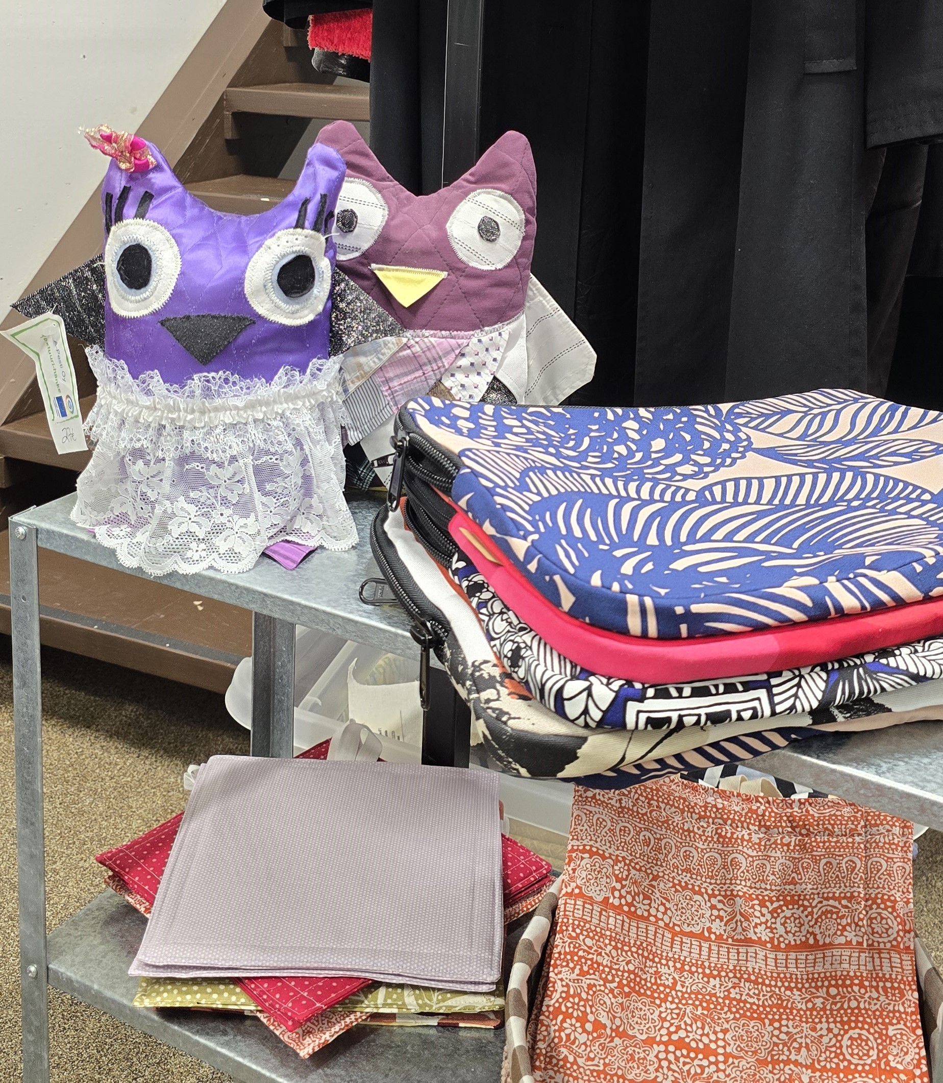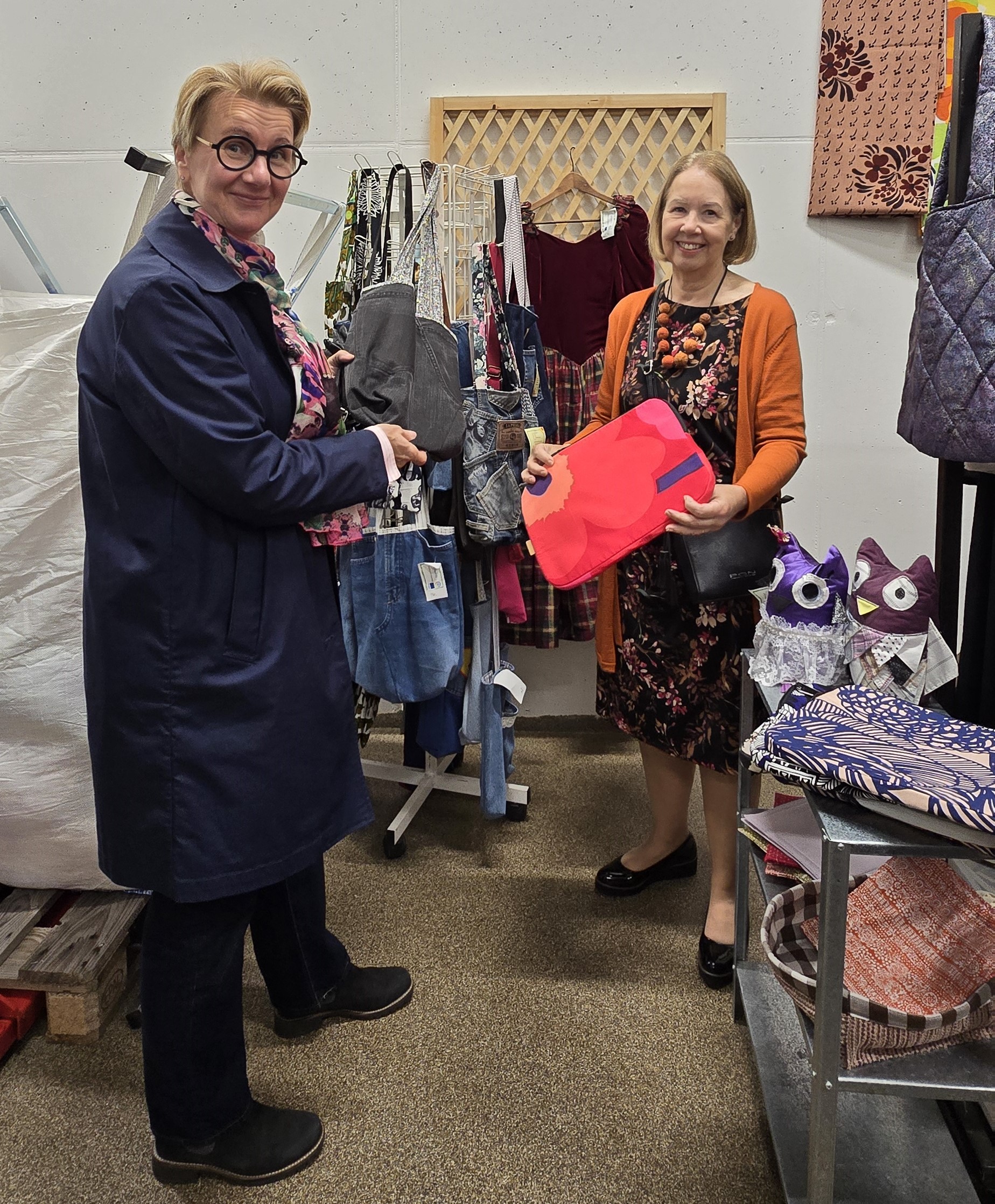 Alavuden kaupungin elinvoimajohtaja Ulla Björn (kuvassa vasemmalla) ja kaupunginjohtaja Liisa Heinämäki ihailivat Textuuri-hankkeessa valmistettuja kierrätyskankaista valmistettuja kasseja ja kannettavan tietokoneen suojalaukkuja. Alavuden kaupunki käyttää myös liikelahjoina ja erilaisten muistamisten pakkaamiseen Textuuri-hankkeen valmistamia, kaupungin etiketillä varustettuja kierrätyskasseja.