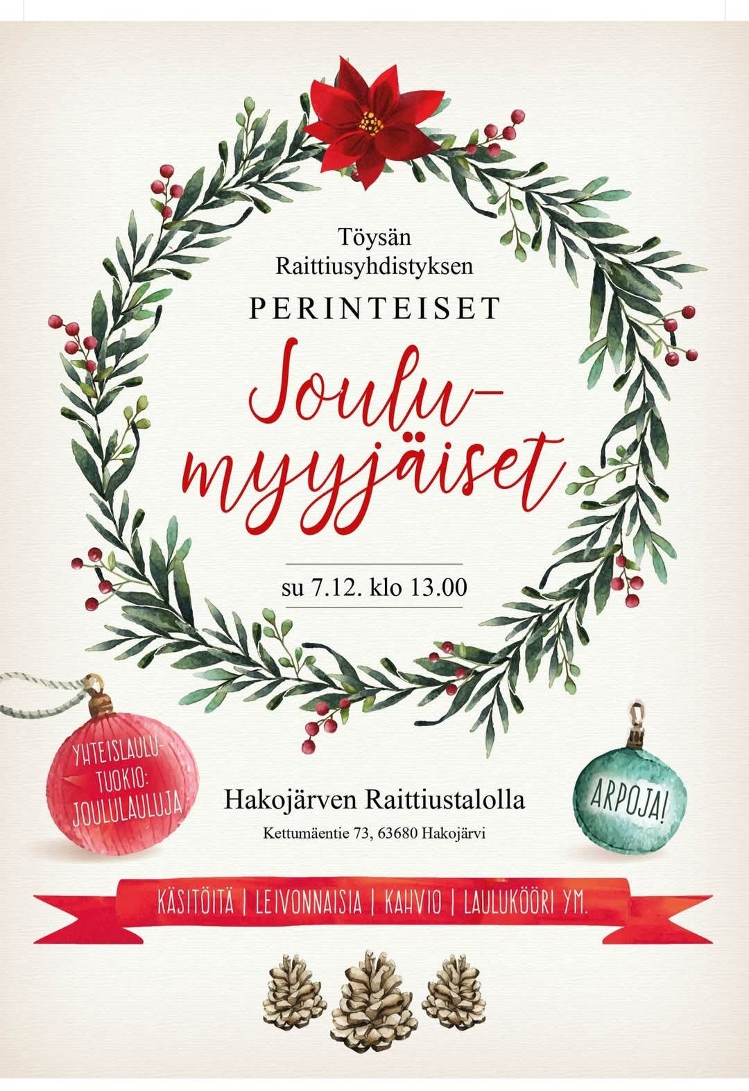 Töysän Raittiusyhdistyksen perinteiset joulumyyjäiset sunnuntaina 7.12.2025 klo 13 Hakojärven Raittiustalolla.