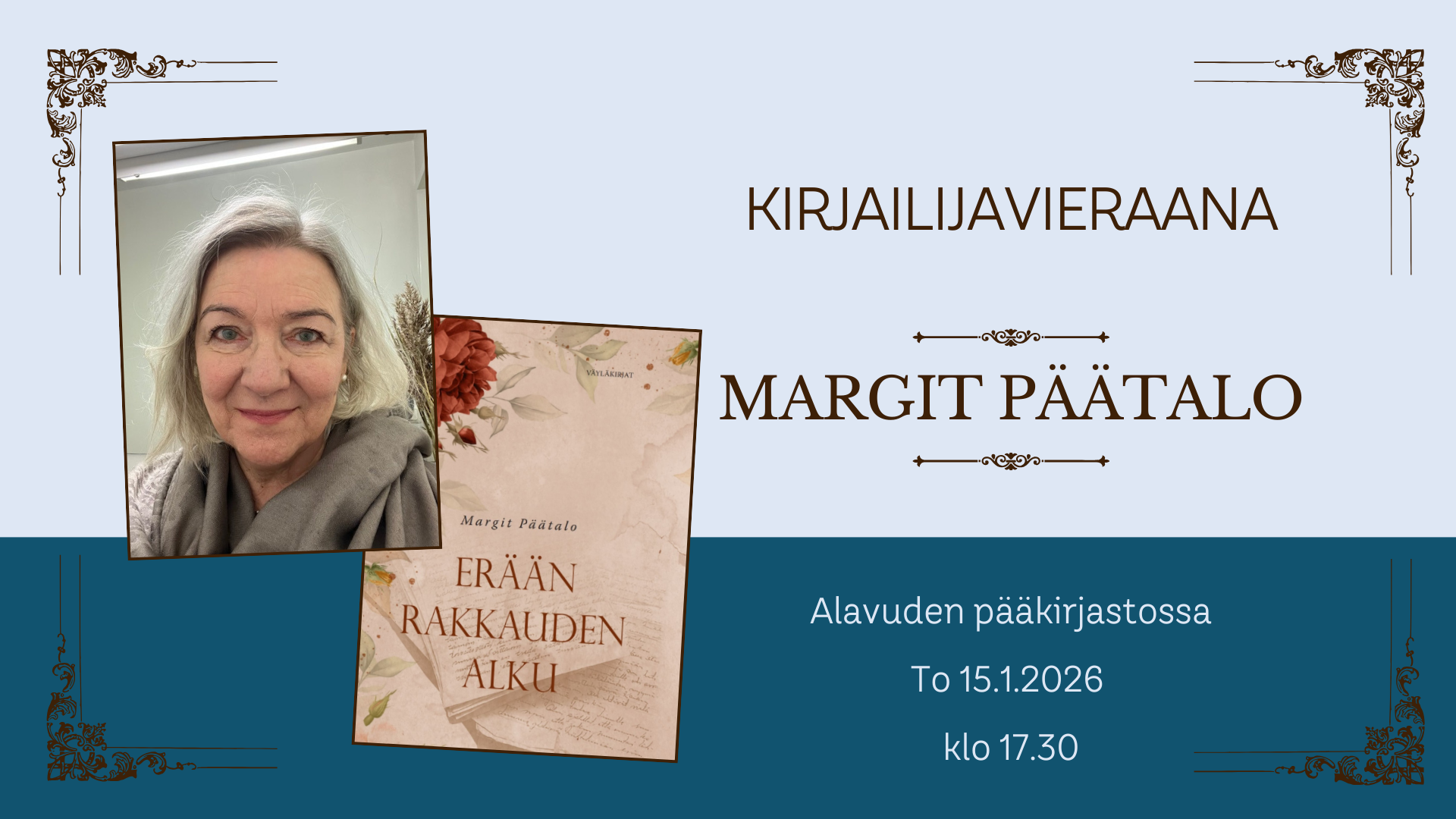 Kirjailija, filosofian tohtori Margit Päätalo kertoo esikoisromaanistaan "Erään rakkauden alku" Alavuden pääkirjastossa torstaina 15.1.2026 klo 17.30 alkaen. Kirjailijaa haastattelee Kyösti Härkönen.