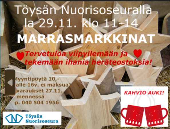 Tervetuloa Marrasmarkkinoille Töysän Nuorisoseuralle lauantaina 29.11.2025 klo 11-14.
