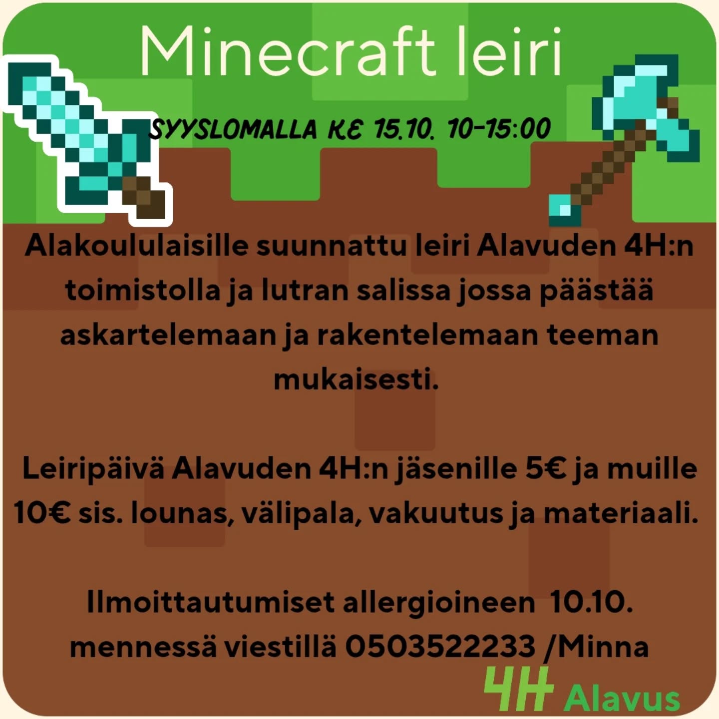 MINECRAFT-leirin alakoululaisille ke 15.10.2025 klo 10.00-15.00 Alavuden 4H:n toimistolla ja Kunto-Lutran salissa.
